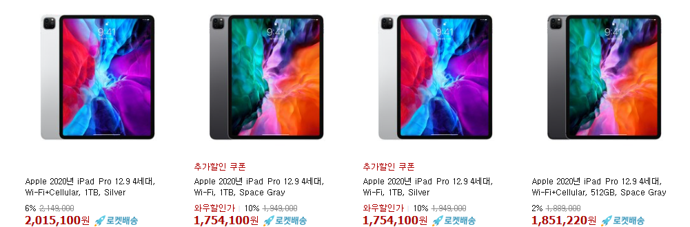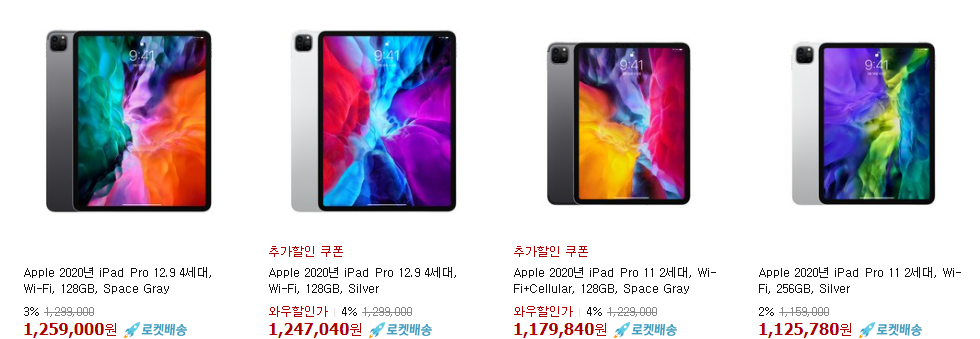 아이패드의 경우 제품(모델)에 따라서 할인 폭이 다르지만 가장 크게는 10%까지 할인 중이네요.